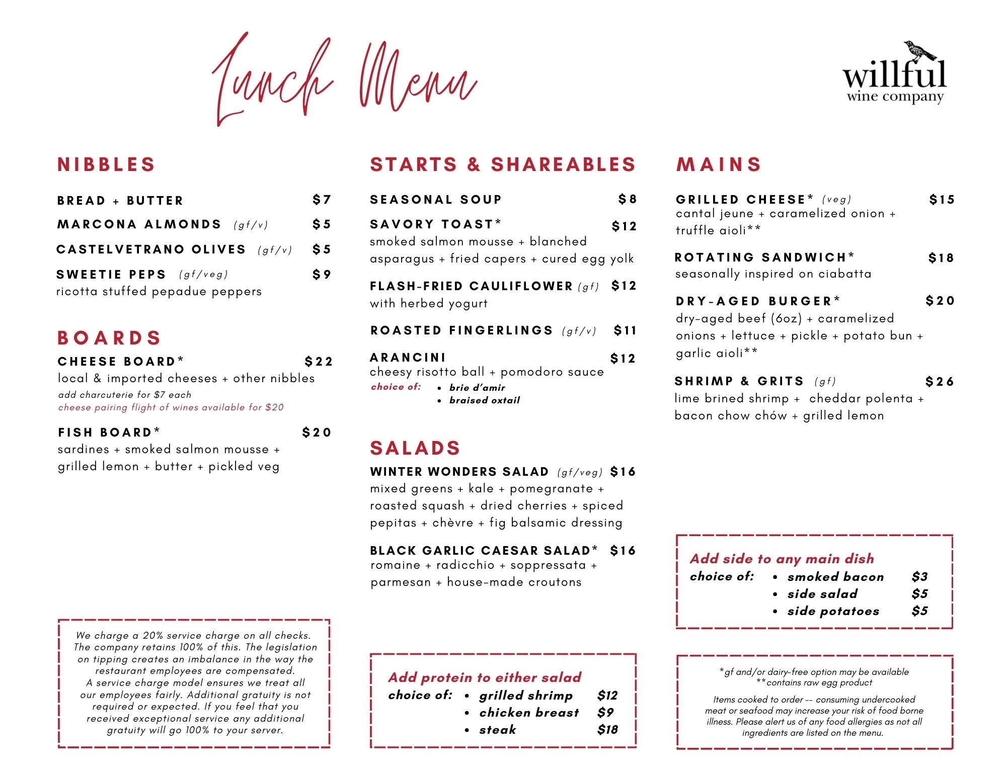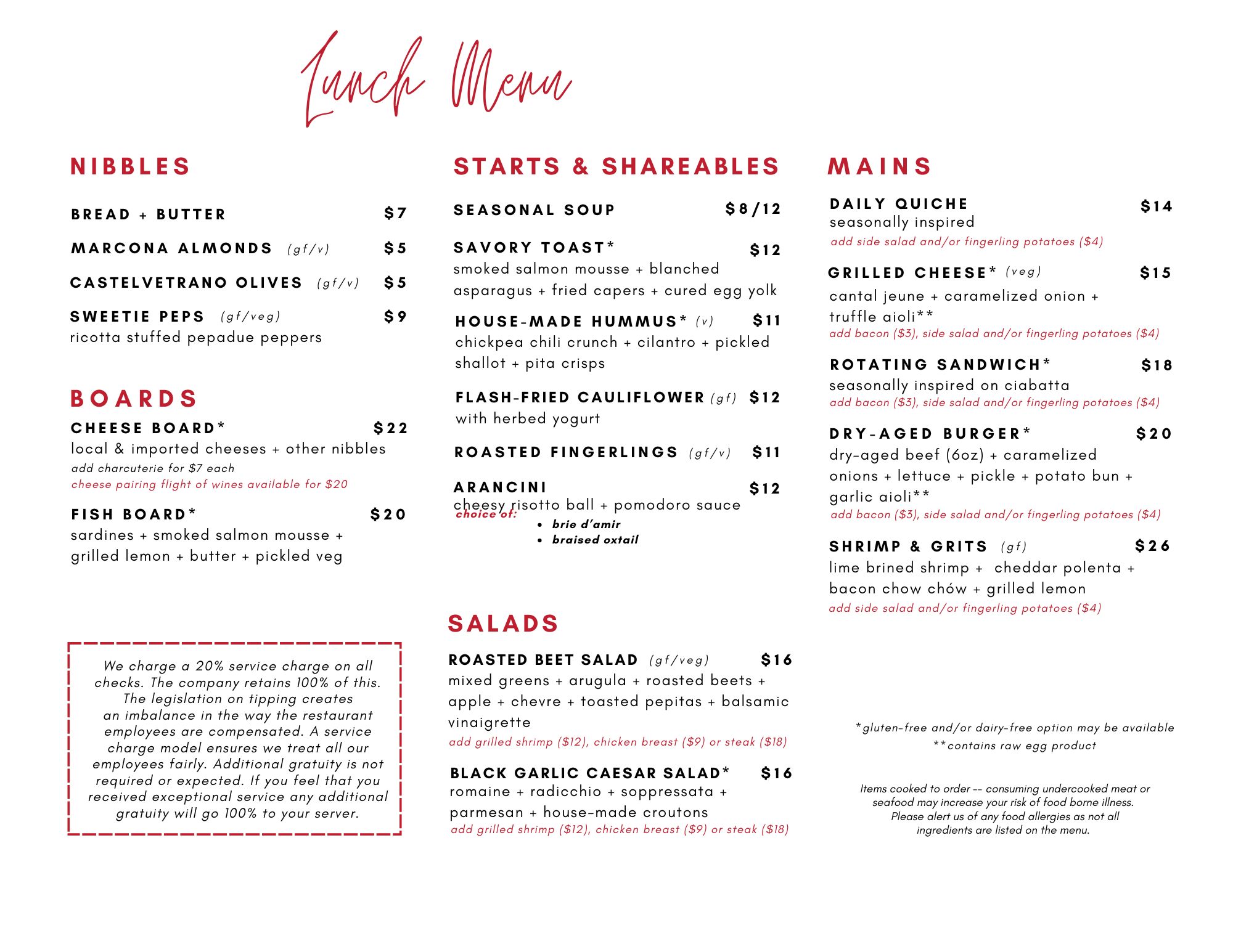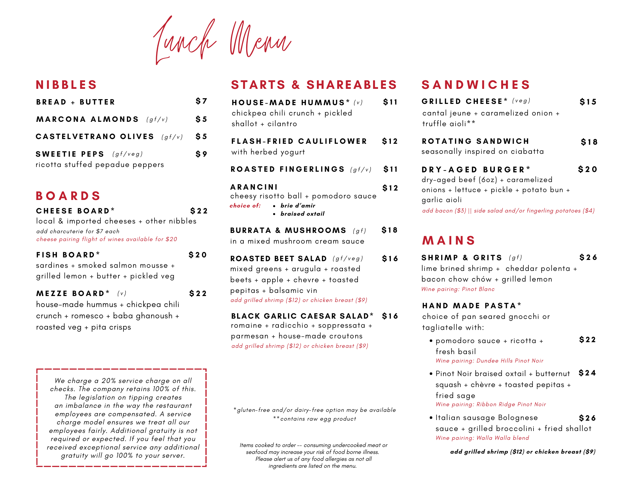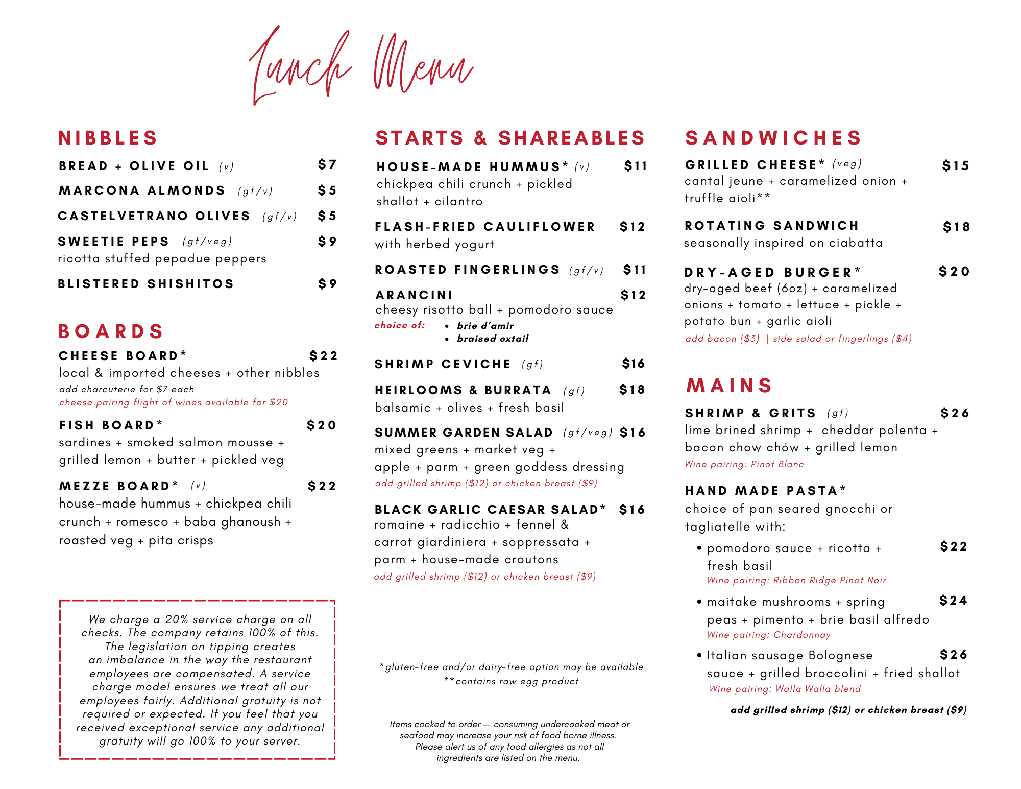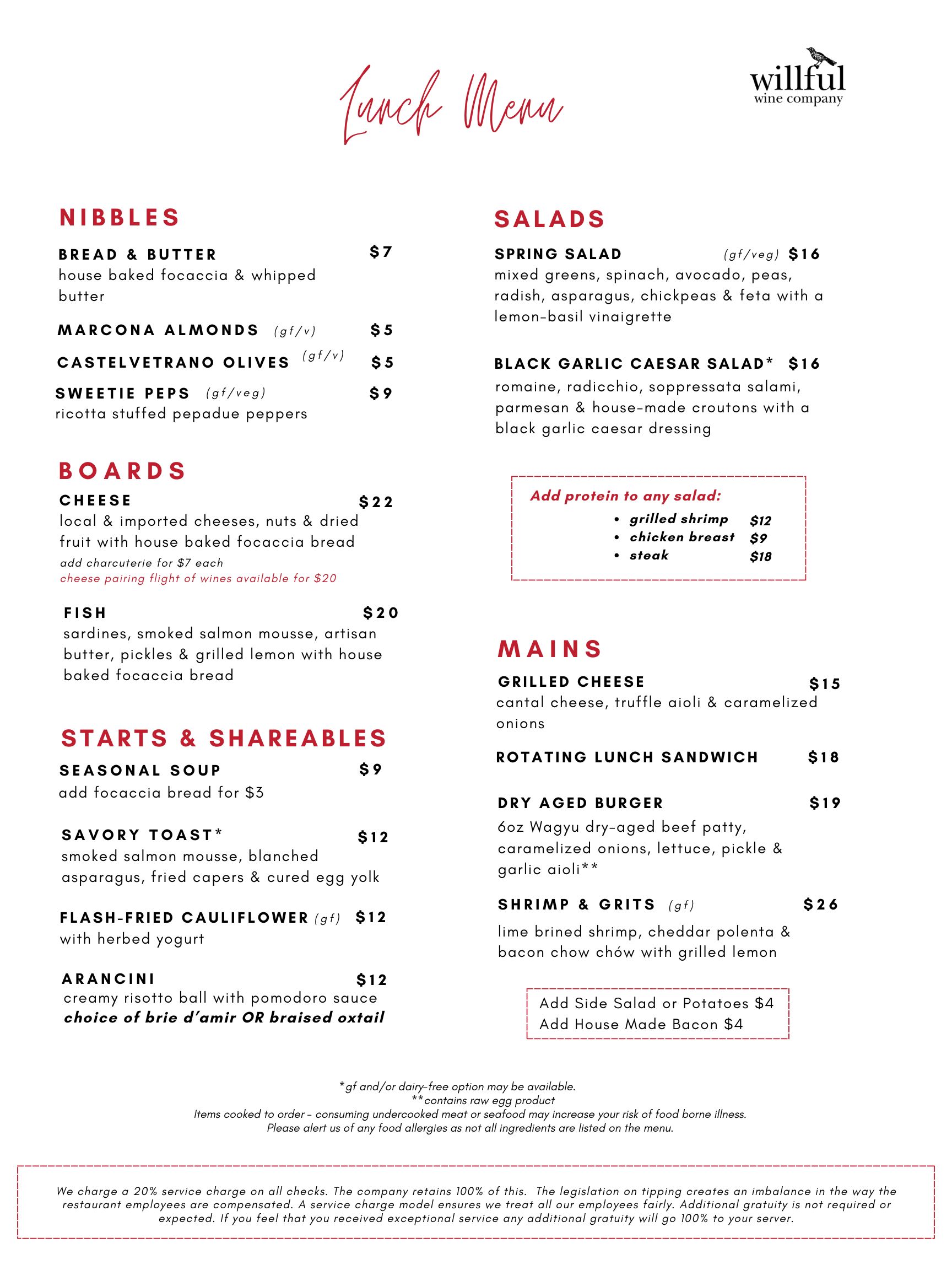 Our food focuses on high quality ingredients and local suppliers. Our lunch menu is available from 12pm to 2:30pm, Wednesday through Sunday, with a limited bistro menu from 2:30pm to 4:30pm.